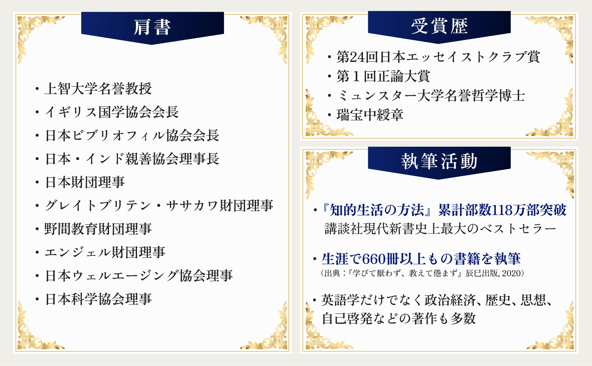 “学長になったとき、故:渡部昇一先生から1つの短冊をいただきました。中年になって、壮年になって学べば、年をとっても衰えないぞというものです。つまり、学長になって、その地位に安住していると学べなくなる。そうすると、学長を辞めたときに学者としての道が狭まってしまう。だから、学長になったら、倍ぐらい勉強しなさい。倍ぐらい本を出しなさい。倍ぐらい論文を書きなさい。というのが、その先生の短冊に込められた意味だったと思います。